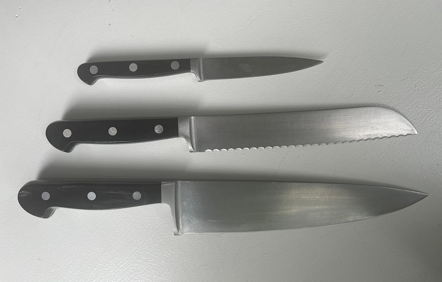 Chef’s knife: Handles the majority of chopping, slicing, and dicing tasks. It’s hands-down the most used knife of my set.